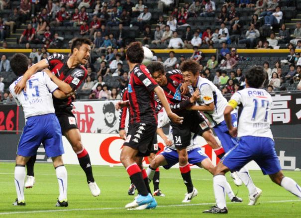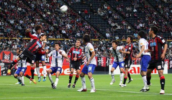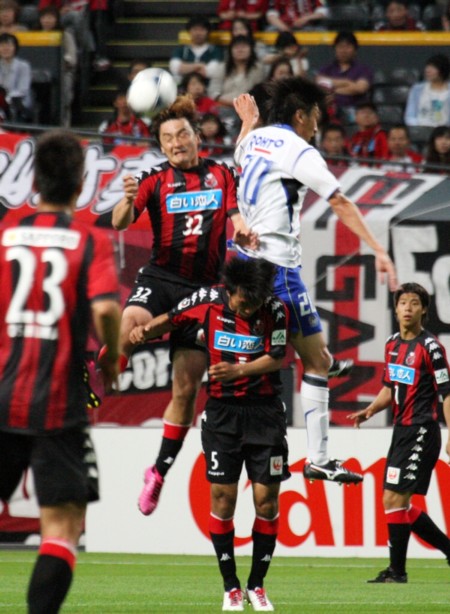 上写真/前半13分札幌は右からのFKにDF岡山(中央34番)がヘディングシュートをするも、惜しくもゴール右にはずれる。岡山へのマークはガンバDF中澤。これが決まっていれば、その後の展開も変わっていたかもしれない。左端は元札幌のガンバDF今野(15番)、その右札幌FW大島、中央はMF河合