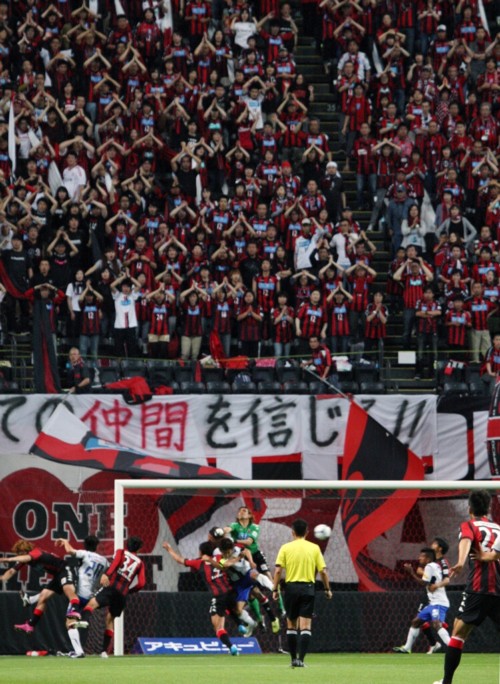 上写真/前半16分ガンバ大阪はMF遠藤の左CKから、中央の密集の中、DF中澤を経て右に流れたボールをFWパウリーニョ(右)がヘディングで決め先制点をあげる。中央札幌GK杉山。ゴール裏札幌サポーターの「踏ん張って!」の願いもむなしく