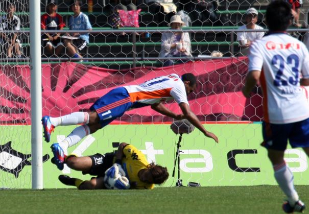 上写真/後半23分新潟のシュートを懸命にキャッチする札幌GK杉山(下)。突っ込んできた新潟FWブルーノ ロペス(上)が勢い余って宙を飛ぶ