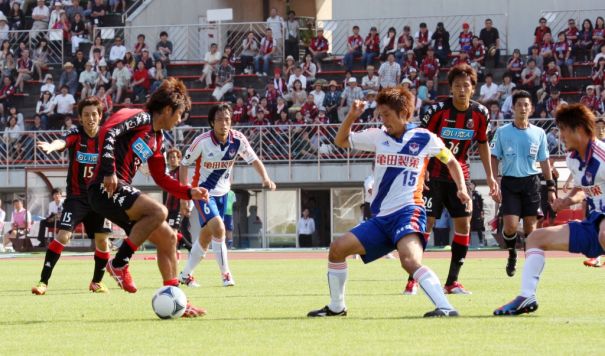上写真/後半45分札幌FW内村(左手前)は新潟ゴール近くに迫るが、新潟MF本間(15番)らの堅い守りに前に進めず。左後方でMF古田が「こっちへ」とボールを要求している。右後方途中出場したFW上原(26番)