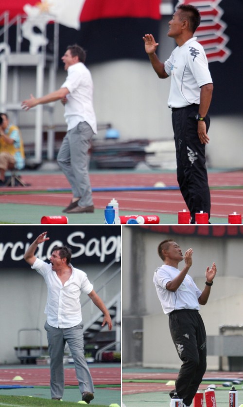 上:上段写真/後半39分、札幌の石崎信弘監督(手前右)と名古屋のストイコビッチ監督が、それぞれに選手に指示を出す