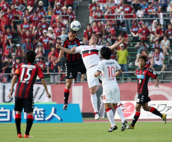 上写真/前半19分札幌DFジェイド ノース(3番)が、名古屋FW田中マルクス闘莉王(4番)と厳しくヘッドで競う。ノースはこの日、再三のピンチを体を張ってクリアし10試合ぶりの勝利に貢献した。左端札幌MF古田(15番)、右端DF金載桓(39番)、10番は名古屋MF小川