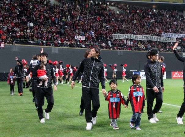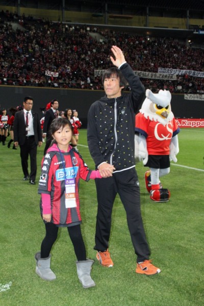 上写真/引退するFW中山もお嬢さんと一緒に手を振る
