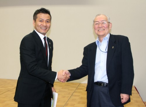 上写真/北海道フットボールクラブの株主総会後、野々村芳和新社長と握手する本紙・池田淳編集長