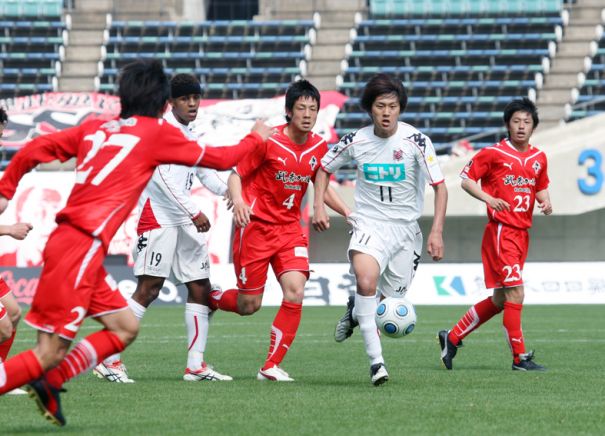 上写真/後半ロスタイム札幌FW宮澤(11番)がゴール前に突進するも、熊本MF宮崎(27番)にクリアされてシュートを打てず。宮澤はこの日、積極性に欠け結局シュートはゼロに終わった