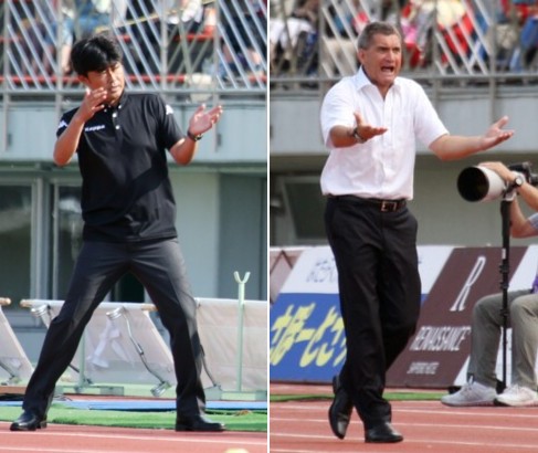 上:右側写真/後半2分、札幌DF奈良への福岡坂田のプレーに対する主審の判定に第4の審判に向かって大きな声で抗議する福岡のマリヤン プシュニク監督