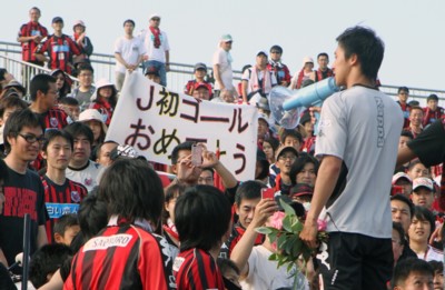 上写真/J初ゴールから一気に2点目も決めてヒーロ―となった札幌MF荒野、ゴール裏サポーター席に引き上げられて「おめでとう」の幕を前にマイクでお礼を述べる