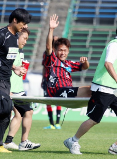 担架で運び出される時、スタンドから一斉に堀米コールが飛んだ。やおら担架の上で上半身を起こした堀米がゴール裏サポーターに向かって笑顔で手を振った。瞬間シャッターを切っていた。通常、負傷した選手が担架で運びだされる時、ほとんど写真など撮らない。