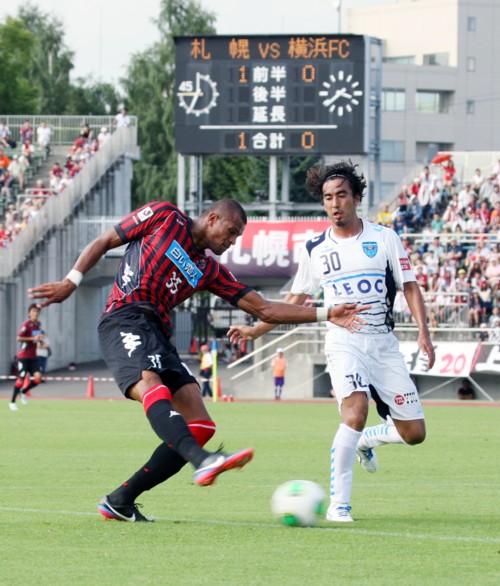 8月11日の横浜FC 戦、コンサドーレ札幌の新外国人FWフェホ(35番)が前半21分待望の来日初ゴールを決めた。それに勢いづいたか、フェホは前半34分にも、似たようなシュートシーンを得た。