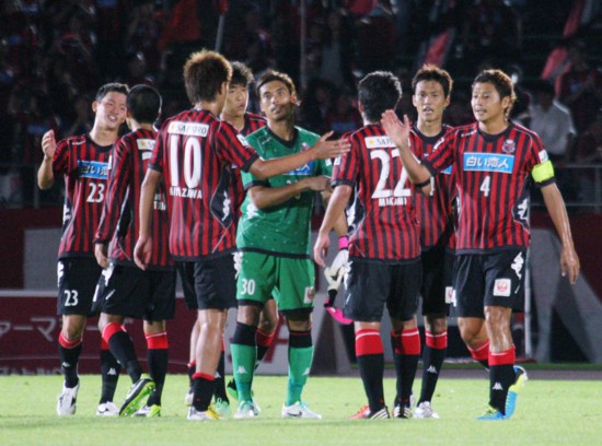 上写真/3−0と愛媛を完封で破り健闘を称えあう札幌の選手たち。左からDF奈良(23番)、久しぶりに先発した松本、MF宮澤(10番)、DFチョ ソンジン、GK杉山(30番)、MF三上(22番)、DF上原、そして2か月半ぶりに復帰したキャプテンMF河合(4番)