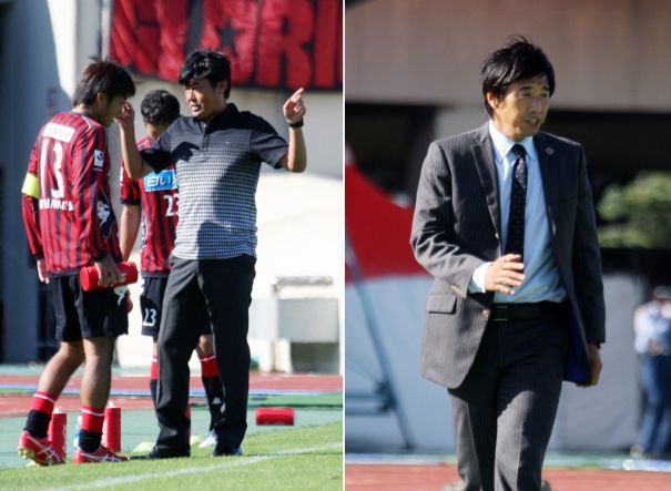 上:左側写真/後半13分ゲームキャプテンFW内村(13番)を呼んで大きな手振りで指示する札幌の財前恵一監督