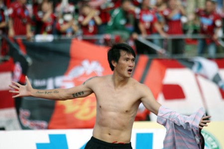 上写真/前半15分Jリーグ初得点となる決勝ゴールを決めたベトナム人選手、札幌のMFレ・コン・ビンは興奮したためかユニホームを脱いでしまい、イエローカードをもらう。この後、36分にも反則を犯し退場となった