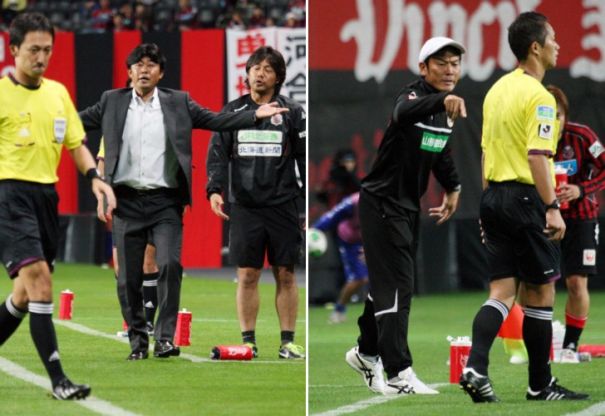 上:左側写真/後半4分タッチラインを割ったボールの主審の判定に対し大きなジェスチャーで抗議する札幌の財前恵一監督