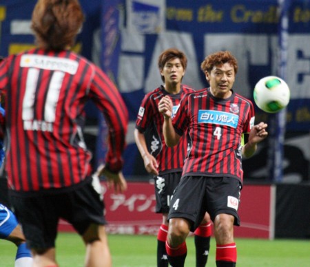 上写真/後半12分久し振りに先発した札幌キャプテンMF河合(4番)は後方のMF宮澤とともに、ボランチとしてチームを牽引し勝利に貢献した。左札幌MF前田(11番)
