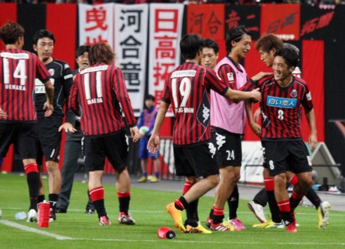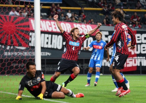 上写真/コンサドーレ札幌のMF砂川(右端)が後半16分にFKを直接決めてゴールし、ベンチ前でチームメイトに祝福され笑顔を見せる。記念すべきJリーグ500試合出場に花を添えた。左奥に財前監督、名塚コーチの顔も見える