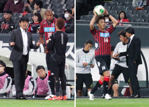 上:左側写真/後半31分、この後、MF前田に代えて投入するFWフェホに通訳を通して入念な指示を与える札幌の財前恵一監督(左)