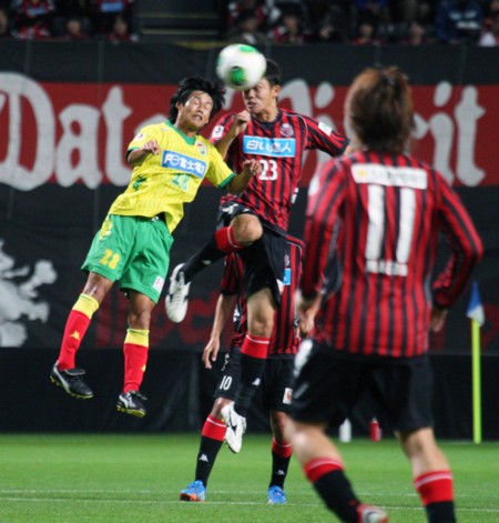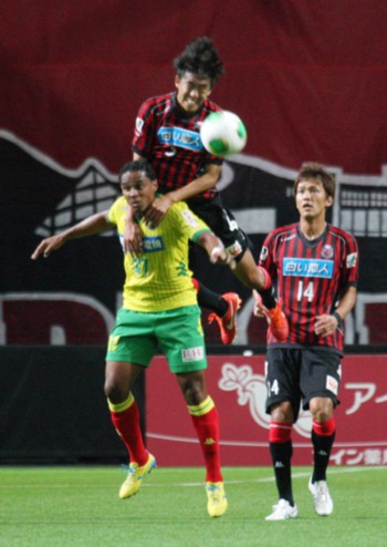 上写真/前半24分札幌DF奈良(23番)と千葉FW町田(28番)がヘッドで競い合う。奈良は前節のミスで敗戦した教訓を生かし、体をはったプレーでこの日の勝利に貢献した。手前札幌MF前田(11番)
