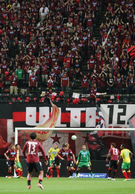 上写真/前半36分千葉右CKからの攻撃を札幌DFチョ・ソンジン(中央5番)がクリア。ゴール裏サポーターが熱い声援で後押し