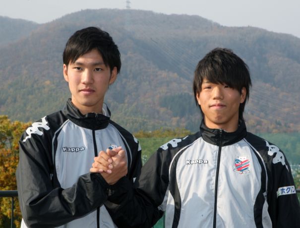 上写真/トップチームに昇格が決まった内山裕貴(左)と前寛之。11月4日、札幌白い恋人宮の沢サッカー場、撮影・石井一弘