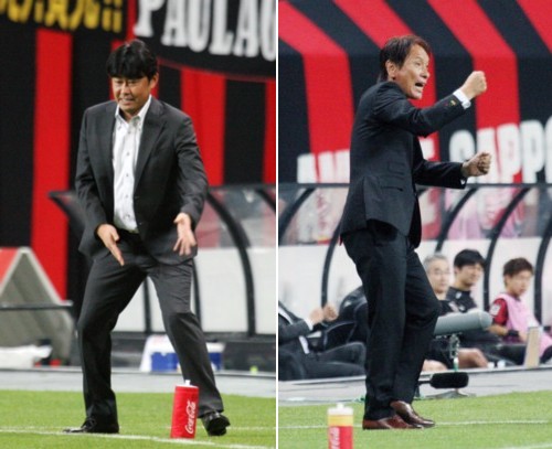 上:左側写真/後半13分全身を使って選手に指示を出す札幌の財前恵一監督。あたかも踊っているようだ