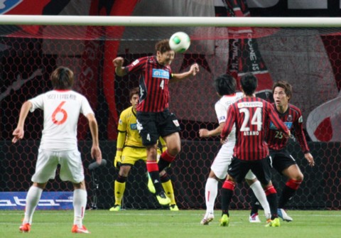 上写真/前半19分北九州の攻撃をヘッドでクリアする札幌キャプテンMF河合(4番)、右端DF櫛引(25番)、その左MF荒野(24番)、左端北九州MF森村(6番)