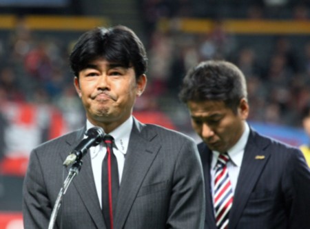 上写真/11月24日、シーズン最終戦、ギラヴァンツ北九州戦後のセレモニーであいさつする札幌の財前恵一監督。プレーオフ進出を逃した後とあってその表情は厳しい。右は北海道フットボールクラブの野々村芳和社長