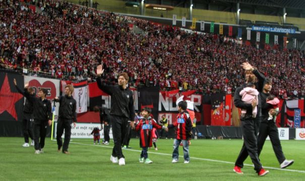 上写真/ギラヴァンツ北九州戦後、シーズン終了のサンクスウォークで子供たちを連れてサポーターにあいさつする札幌の選手たち。いっぱいのスタンドから温かい声援が飛んだ