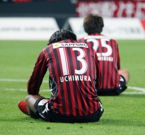 ギラヴァンツ北九州戦が終わった瞬間、1トップで出場していたコンサドーレ札幌のFW内村(13番)がピッチに座り込んだ。