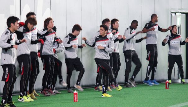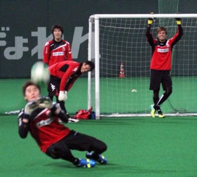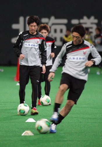 上写真/2014年コンサドーレ札幌の活動がスタートした。1月16日は札幌ドームでトレーニング。体をほぐす選手たちの間にも、オフの間にトレーニングをしてきた選手とそうでない選手で差があったようだ
