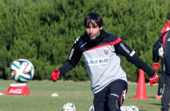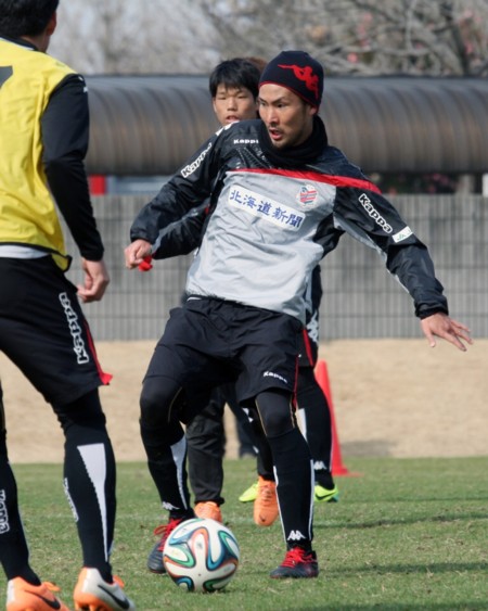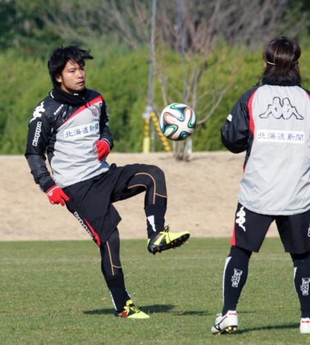 上写真/コンサドーレU−18出身で阪南大学から新加入したFW工藤、昨年途中から特別指定選手として、すでに数試合出ているが、今年は結果が求められる。右の背中はMF菊岡