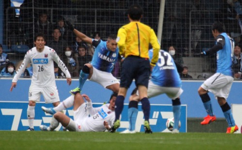 上写真/開幕戦先発でセンターバックを任された札幌DF小山内(26番)と櫛引(倒れている)が前半34分、磐田の強力FWポポ(7番)とMFフェルジナンド(32番)の猛攻を必死で守る