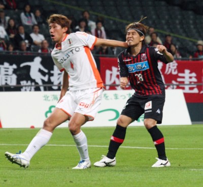 上写真/前半35分、札幌MF菊岡(28番)はビッグチャンスをゴール上に外した上に、愛媛DF西岡(4番)の腕が首筋に当り“痛ーい!一発”踏んだり蹴ったりだった