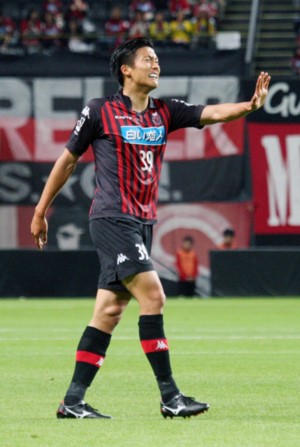 上写真/後半10分、札幌FW都倉(39番)のシュートはゴールの上に外れる。「ゴメン、ゴメン」といった表情