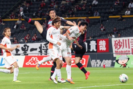 上写真/後半15分、札幌DF日高の右クロスにFW都倉が愛媛DF代(3番)、ハン ヒフン(28番)と競りながらヘディングシュートを放つがゴールならず。右端札幌MF前、奥にDF石井の顔も