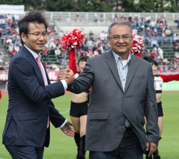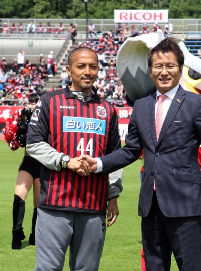 上写真/札幌への入団が決まって最初のホームゲームとあって、試合開始前44番のユニホームを着てサポーターにお披露目をする小野伸二選手。右はHFCの野々村芳和社長