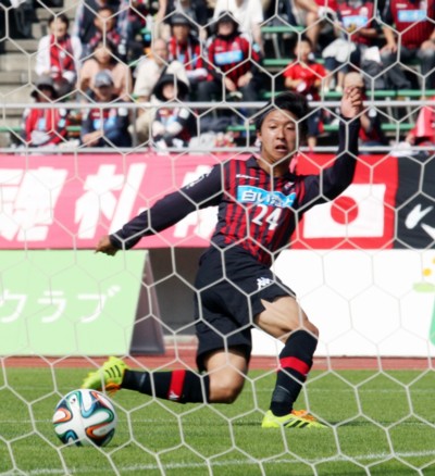 上写真/前半29分、コンサドーレ札幌のMF荒野(24番)が、砂川とのワンツーで抜け出ると、カターレ富山DFのこぼれ球を拾って、最後はGKをかわし先制ゴール。荒野のゴールは2試合連続となった