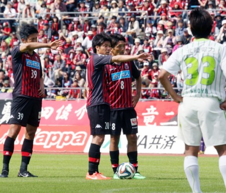 上写真/前半34分、札幌MF砂川(8番)が倒されてFKのチャンスを得る。MF上里(20番)とFW都倉(39番)が同じような格好で壁に入るチームメイトの位置を指示、この後、35分に砂川が直接ゴールを決めて貴重な追加点を上げる。右端富山FW中島(33番)