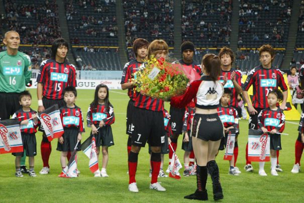 下写真/愛媛FC戦で通算100試合出場を達成する札幌のMF藤田(7番)にコンサドールズのキャプテン西桜子さんから花束が贈られた。桜子さんは西大伍選手(右端の22番)の妹さん。