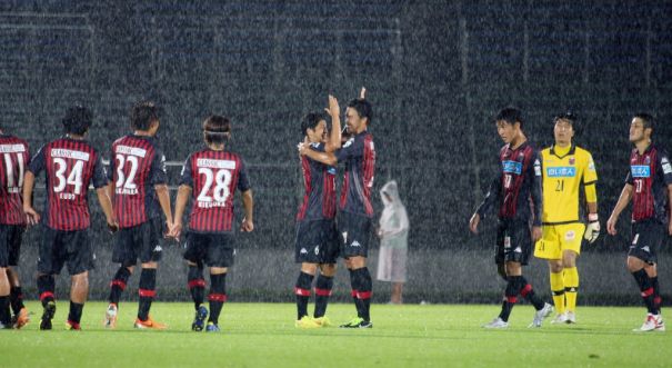 前半は無風、気温23度と4基の照明に照らされたピッチは最高。だが後半は全道的に大雨の警報が出た天候になり、スリッピーなコンディション。コンサドーレは、前田俊介をリーダーにGK杉山哲がキャプテン。日ごろのリーグとは一味違うスタメンでゲームに臨んだ。トップには190センチの丁成勲(チョン ソンフン)、前田の両脇に工藤光輝と菊岡拓朗。ボランチは前貴之と中原彰吾。DFは、初登場のステファノ(オランダ)を右に、内山裕貴と松本怜大がCB、左には上原拓郎が入った。立ち上がりの3分に中央で前が左ライン際の菊岡に大きく開いたパス、ゴール前に走り込んだ前田にセンタリング、相手DF2人とGKの間に飛び込んだ前田が、ヘディングを決めて先制した。38分にも拓郎―前田が絡んだパスで工藤が決めてリードした。