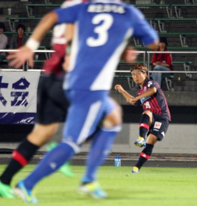 上写真/前半3分、札幌MF前貴のパスを受けた菊岡(28番)が中央に走りこむ前田に絶妙のクロスを入れ、先制点をアシスト