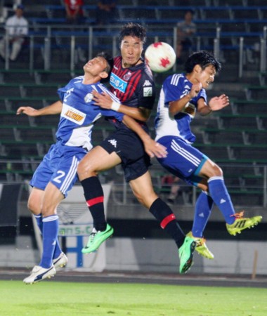 上写真/前半20分、札幌FWチョン ソンフン(中央)がMFステファノの右からのクロスに、前橋DF間下(2番)、本間(右)に挟まれながらヘディングシュートを放つが、惜しくもゴール右にはずれる。チョンは後半21分、23分とたて続けにゴールを決め札幌の勝利に貢献した