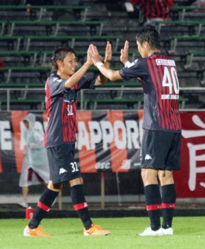 上写真/後半21分、札幌のFWチョン ソンフン(40番)が3点目のゴールを決め、アシストしたMF中原(32番)に駆け寄ってハイタッチして喜ぶ