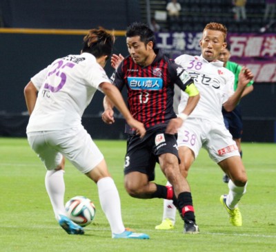 上写真/前半3分、札幌右CKからの攻撃は京都MF中山(15番)に跳ね返される。左端札幌DF石井(19番)、同上原慎(14番)がこぼれ球を狙う