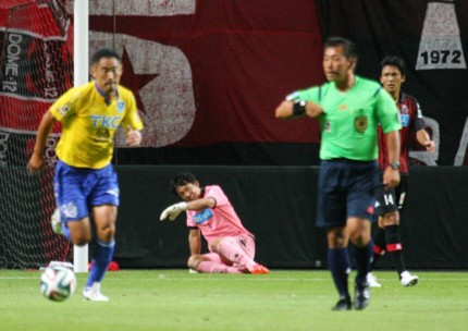 上写真/前半10分?、栃木DF荒堀に先制ゴールを決められガックリの札幌GK金山(1番)、右はDF上原慎(14番)。左はピッチ中央へ戻る栃木FW大久保(39番)