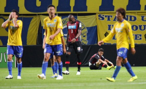 上写真/1−1の引き分けに終わり両軍選手は疲れ切った表情。札幌DF奈良(右から2人目)は、しばらく大の字にひっくり返っていた後、ようやく座り込む。その左はパウロン