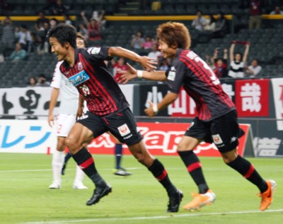 上写真/前半15分、札幌はDF上原拓からのロングボールをMF中原(右)がシュート、GKがはじいたボールをFW都倉(39番)が押し込んで2点目を決め、ベンチに向って走り出す