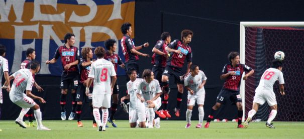 上写真/後半6分?、長崎FWスティッペ(44番)のFKはMF佐藤(18番)に当り、コースが変わったがゴールのワク内に飛んでいた。札幌の壁は左からDF櫛引(25番)、MF中原(32番)、FW都倉、DF上原慎、MF河合、宮澤(10番)、DF上原拓(33番)