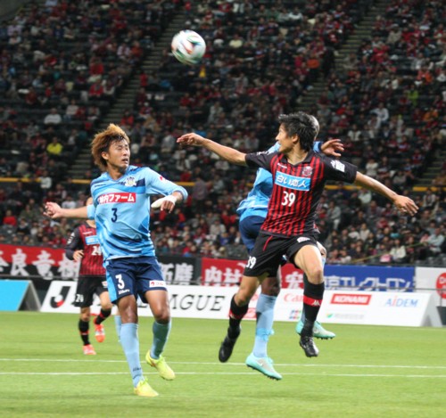 上写真/前半45分、札幌MF宮澤からの縦パスにFW都倉(39番)が受けに行くが、讃岐DFエブソン(都倉の後方)、藤井(3番)に阻まれる