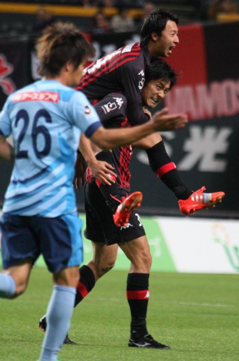 上写真/後半5分、同点ゴールを決めた札幌のFW都倉に飛びついて喜ぶ荒野(上)、左は讃岐MF山本(26番)