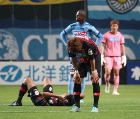 上写真/讃岐と1−1の引き分けとなりピッチに背をつける札幌FW都倉(左)とガックリと膝に手をやるMF中原、右端GK李吴乗、讃岐のDFエブソン(30番)もぶぜんとした表情